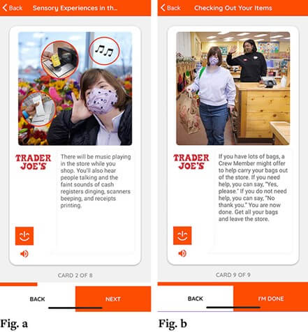 • Using visual cues and step-by-step instructions (with optional audio enhancement), each deck focuses on a different aspect of the Trader Joe’s shopping experience. Examples include “Checking Out Your Items” and “Sensory Experiences in the Store.” (View source 1, 2)