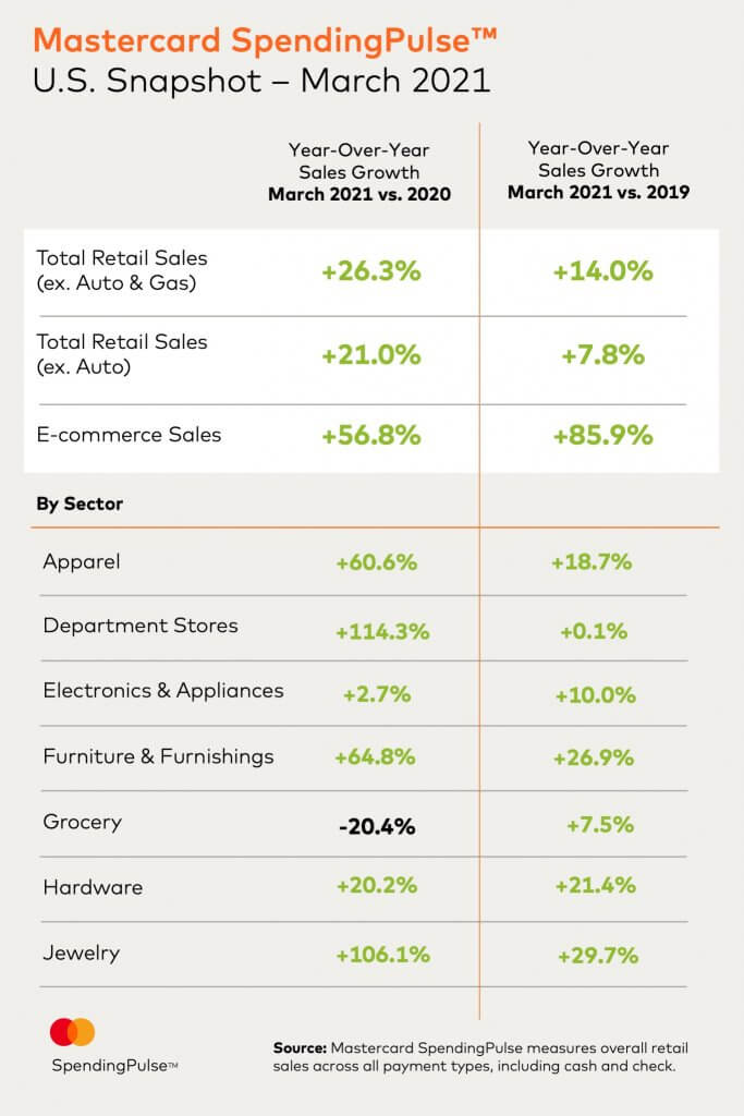• US retail sales (excluding automotive and gasoline) increased 26.3% in March compared to the year-ago period, and online sales grew 56.8%, according to Mastercard Spending Pulse.