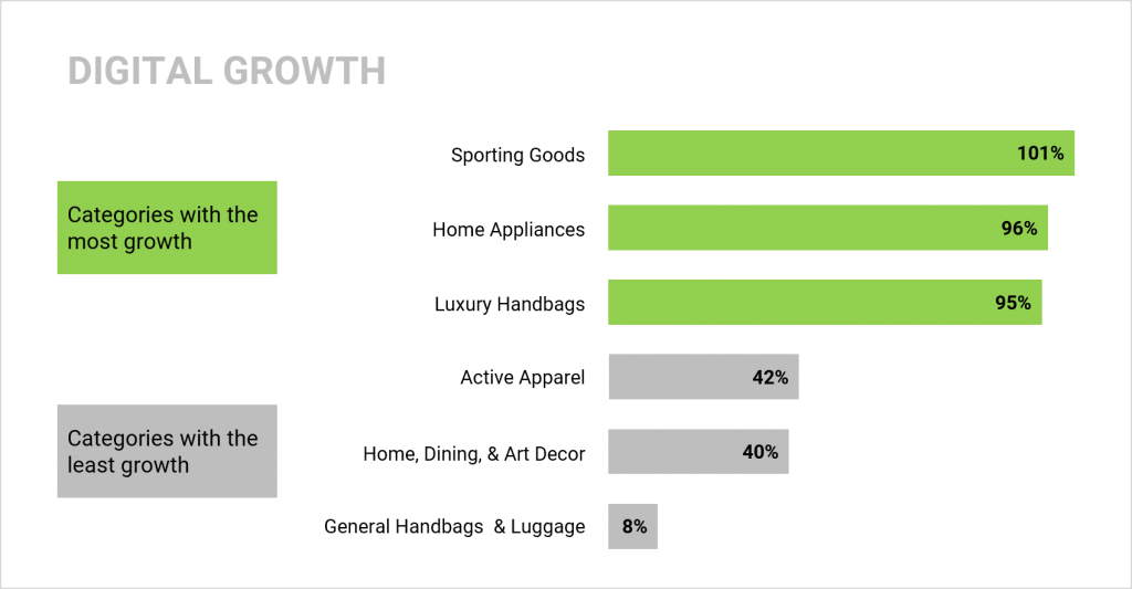 On the other hand, product categories with the lowest YoY digital sales growth for the quarter included active apparel (42%), home, dining, art & decor (40%), and general handbags & luggage (8%).