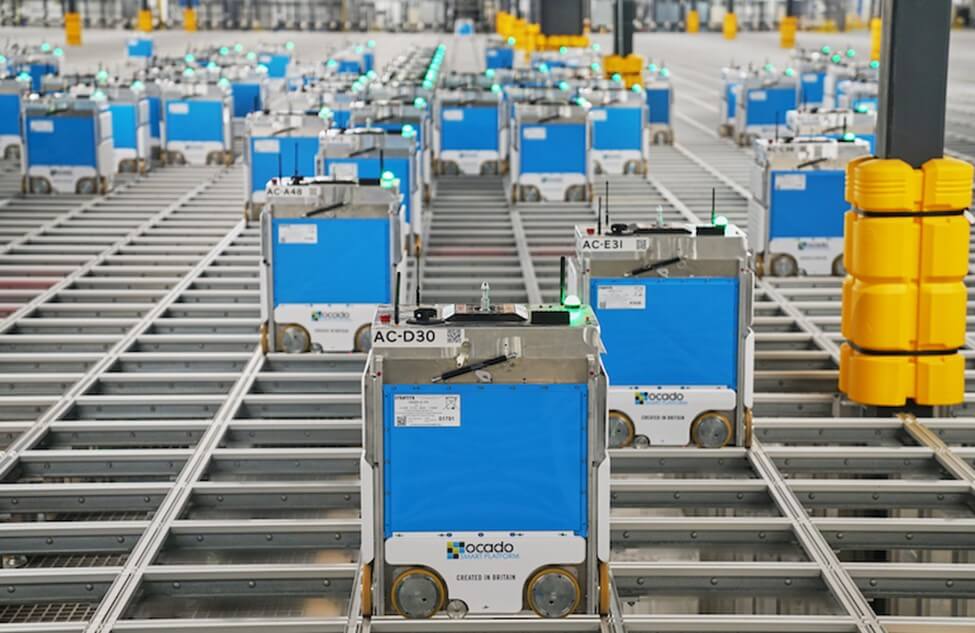 Over 1,000 robots travel around giant 3D grids known as “The Hive”, that contains totes with products and ready-to-deliver orders. As customer orders near their delivery times, the robots retrieve products from The Hive, which are presented as pick stations for items to be sorted for delivery. After being packed, orders are loaded into a temperature-controlled Kroger delivery van which can store up to 20 orders. (View source)