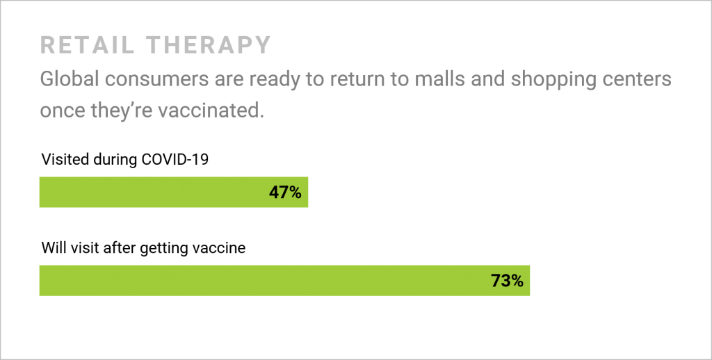 Brick-and-mortar stores are seeing some light at the end of the tunnel with consumers indicating a strong desire to return to malls and shopping centers once they are vaccinated. 73% of consumers who typically visited shopped centers intend to return again after they have been vaccinated.