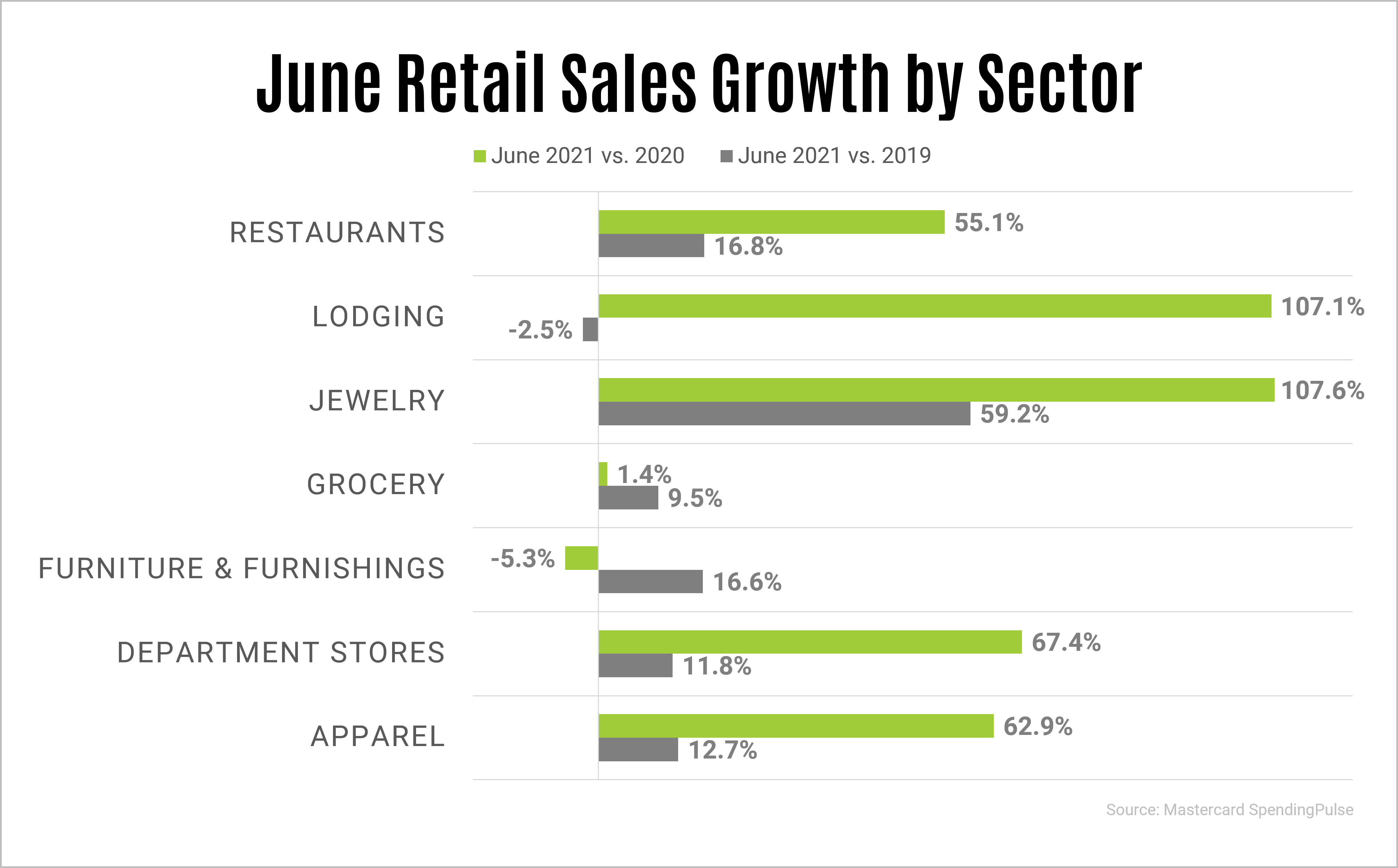 Consumers are continuing to dine out and shop both in-store and online as they refresh their wardrobes for summer activities and travel. Sales growth for restaurants increased 55% YoY and 16.8% compared to June 2019. Department stores sales increased 67.4% YoY and 11.8% compared to June 2019. Apparel sales rose 62.9% YoY and 12.7% compared to June 2019. (View source)