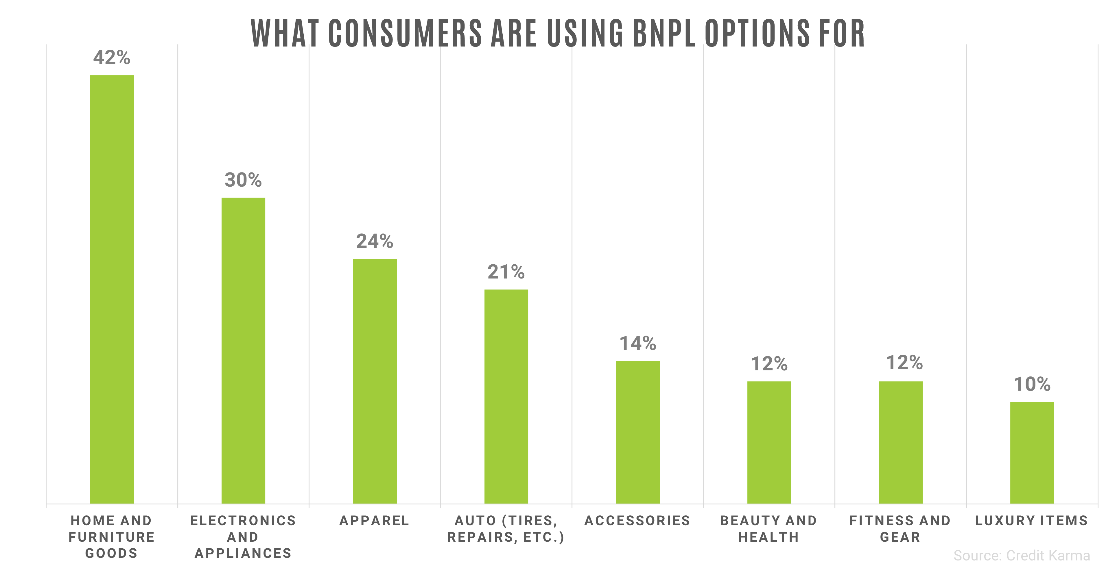 Many consumers, across all generations, used buy now, pay later options due to the burden checkbooks were already feeling due to the everlasting pandemic. In general, almost 30% of consumers still have not fully paid off their 2020 holiday season shopping. Millennials and Gen – Z lead the way with missed payments as 43% of Gen – Z and 31% of Millennials have missed at least one payment. As for what they are making these purchases on, home and furniture goods (known for being bigger ticket items) top the list at 42%.