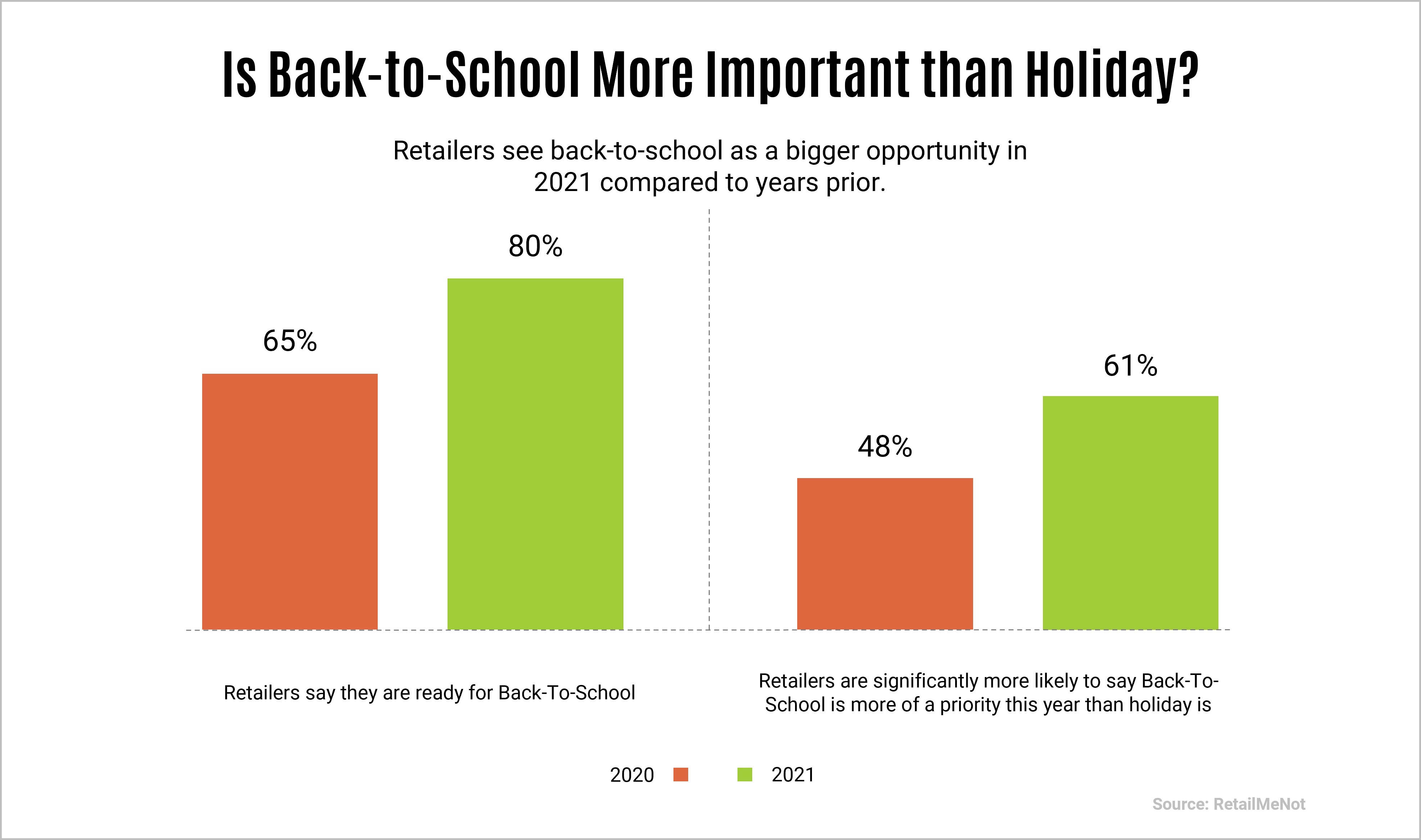 Retailers see back-to-school as a bigger opportunity in 2021 compared to prior years. Despite the current rise in COVID-19 cases across the country, 80% of retailers are ready for back-to-school which is much higher than those who said the same last year (65%). Retailers are ‘significantly more likely’ to say that back-to-school is more of a priority than holiday is (61% in 2021 vs. 48% in 2020).