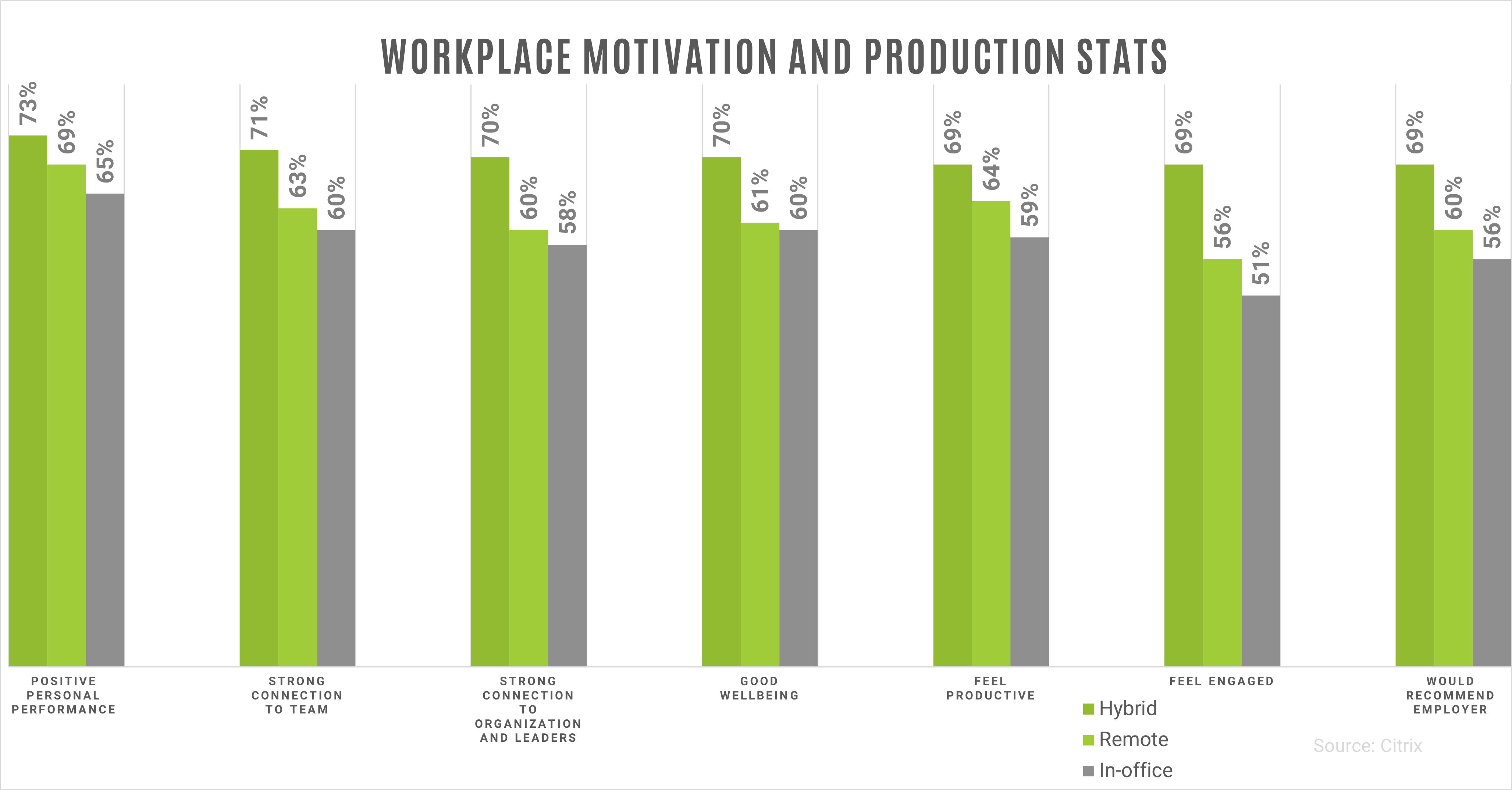 Many are being called back into the office but is that really the way to go? According to a new survey from Citrix, in partnership with Man Bites Dog and Coleman Parkes Research, hybrid work seems to be most efficient all around. When implemented properly, hybrid work leads to a more connected, productive, and healthy workforce: