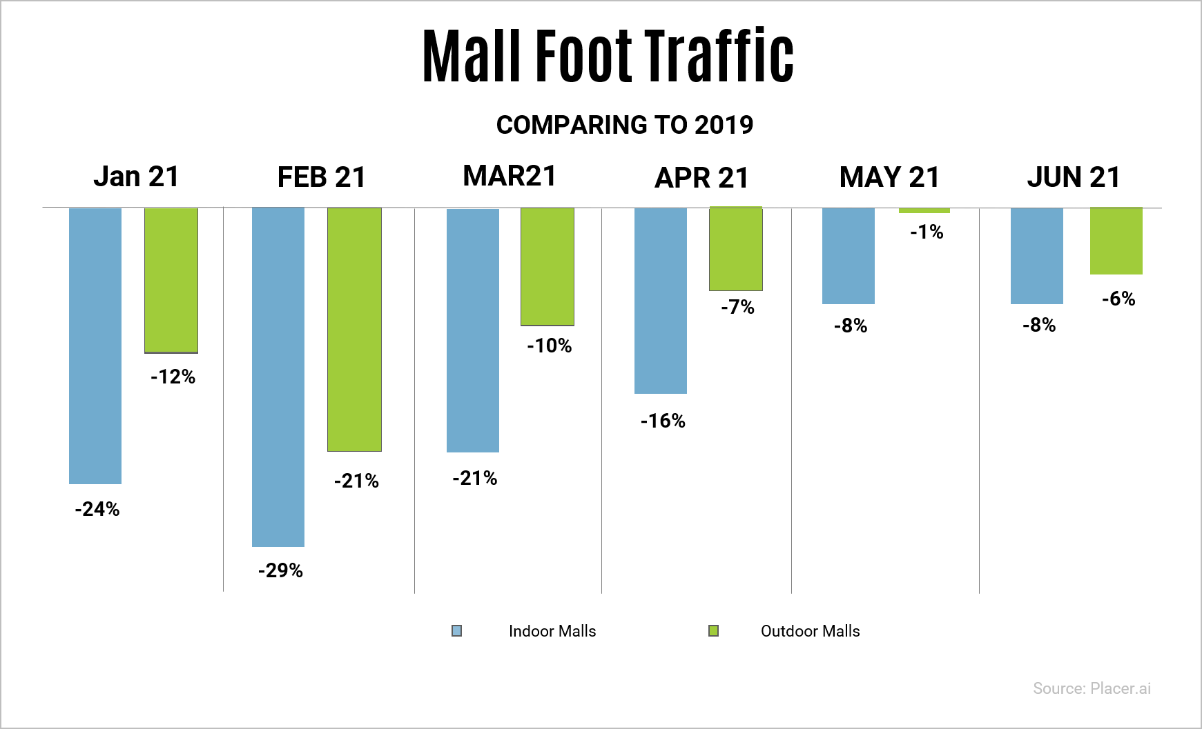 Foot traffic for outdoor malls in June was off only 6% from 2019. Outdoor centers fared better than usual with Memorial Day sales in May while some indoor malls remained closed.