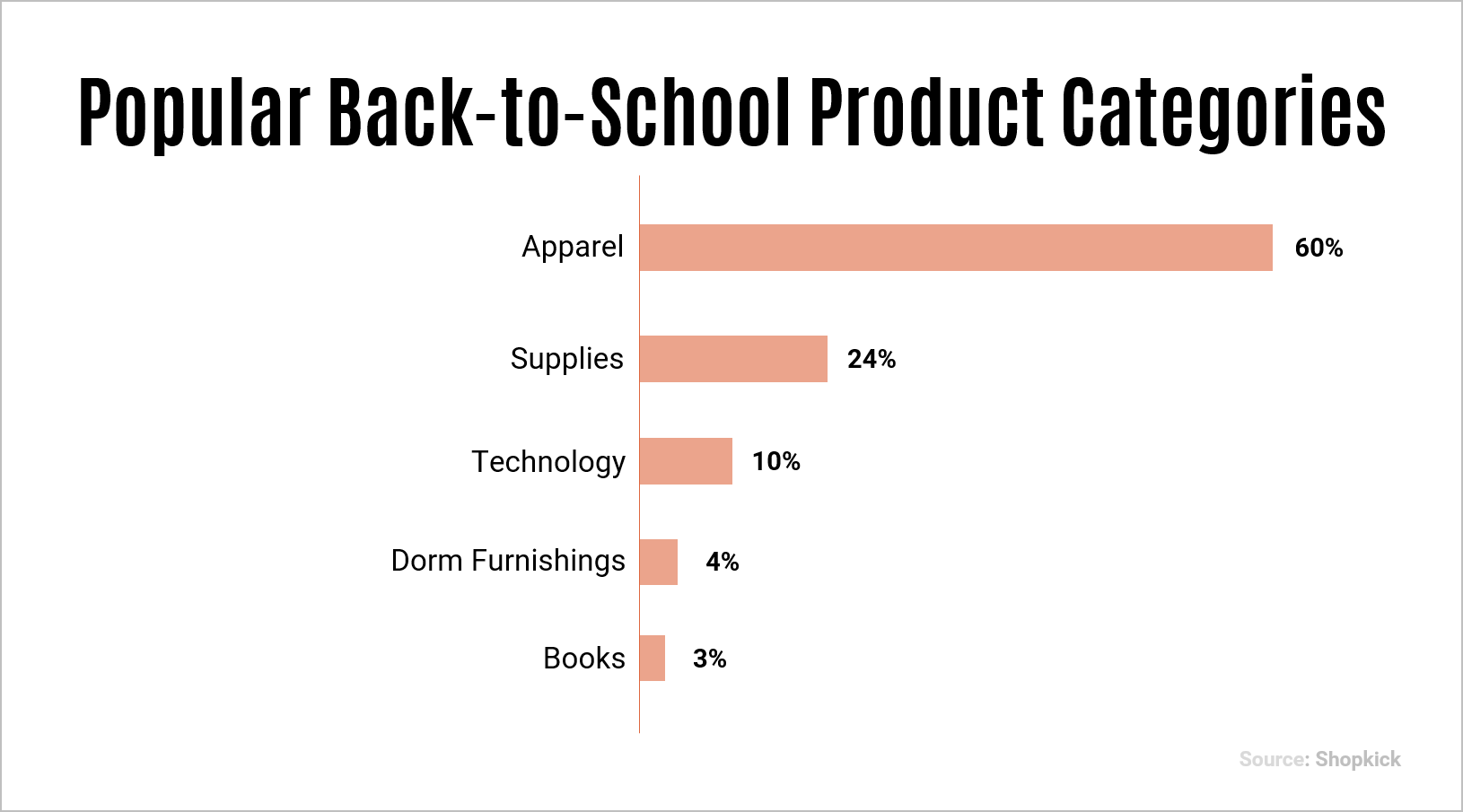 For product categories, apparel will be the hottest with 60% of consumers planning to spend their budget on this category. Basic school supplies are next (24%), followed by technology (10%), dorm furnishings (4%), and books (3%).