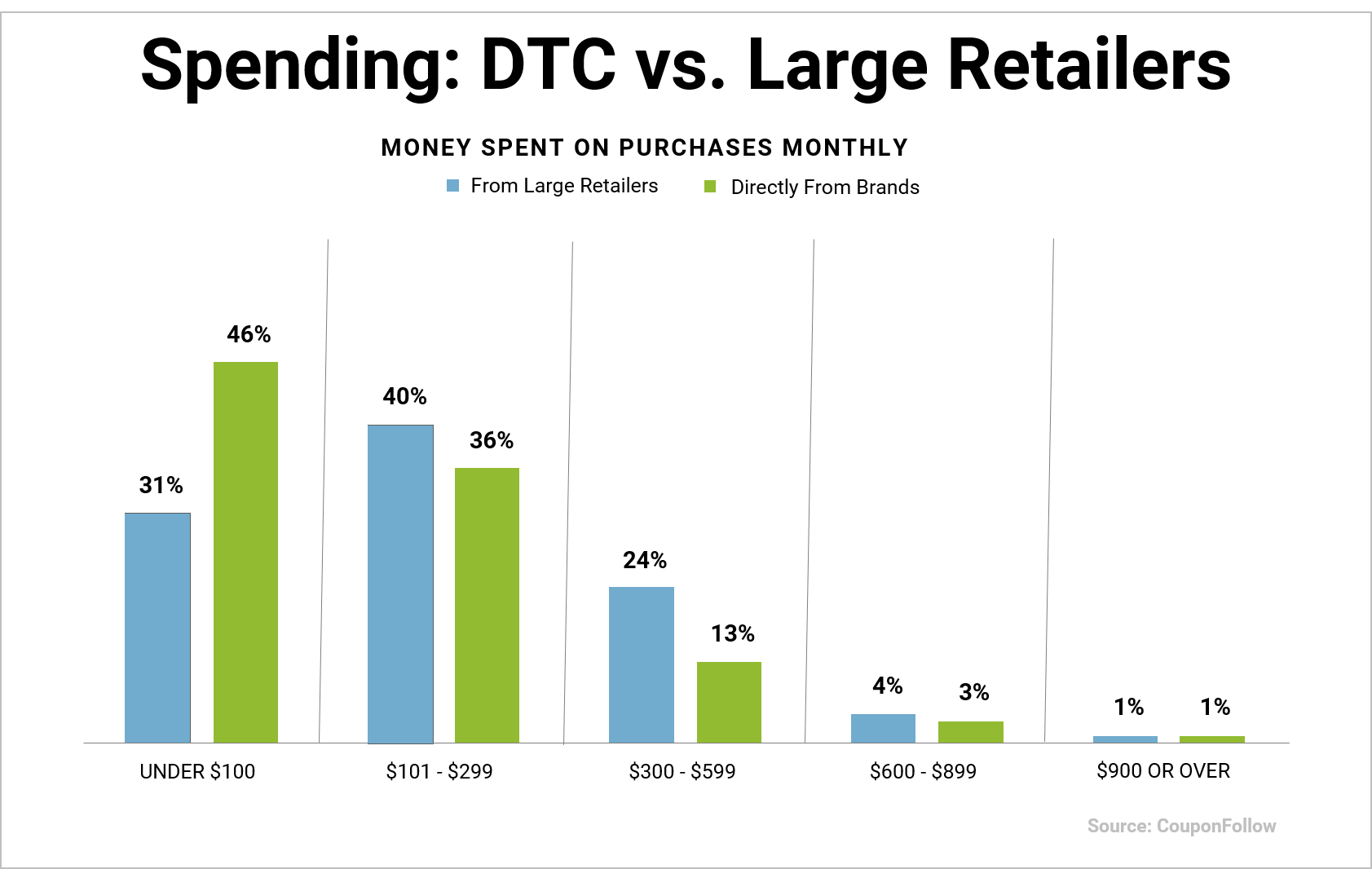 Shoppers that purchased directly from brands usually spent under $100 (46%) and between $100 and $300 (36%). On the other hand, purchases between $300 and $599 were more commonly made through large retailers (24% vs. 13%). 30- to 44-year-olds were most likely to seek out a company that uses the DTC model.