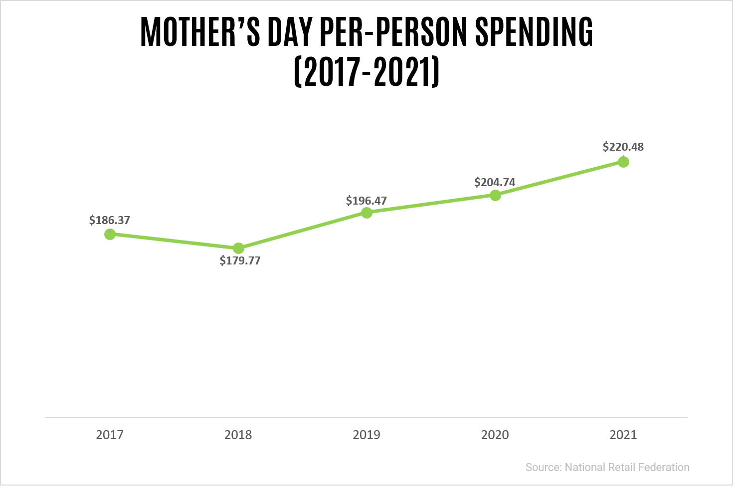 Mother’s Day spending is expected to total a record $28.1 billion this year, up $1.4 billion from 2020, according to an annual survey by the National Retail Federation. Approximately 83% of U.S. adults are expected to celebrate the annual holiday.