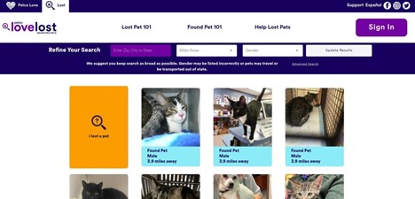 Uploaded photos of a missing pet can be immediately scanned to determine whether there is a match at a participating shelter or rescue in the community. The user-friendly tool can provide initial results in less than a minute to pet owners.