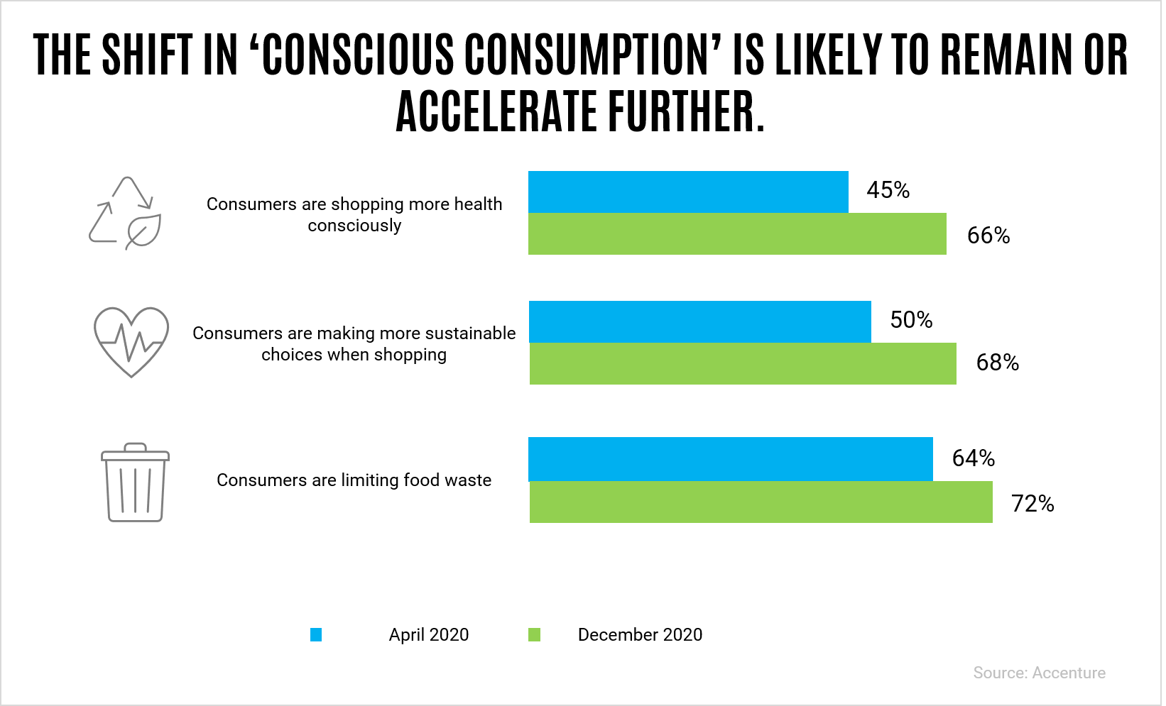 Consumers are taking part in conscious consumption, the practice of seriously considering the environmental and societal impacts of purchase decisions, due to the COVID-19 pandemic. 69% of consumers believe brands should do more to make it easier to consume more consciously.