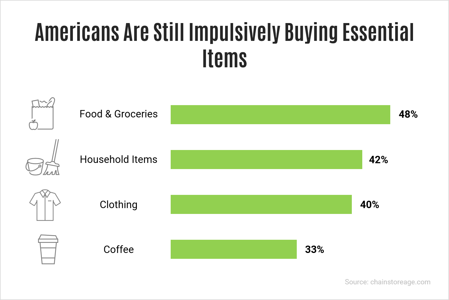 Americans are buying on impulse – again! Consumers spend an average of $276 every month, a 51% increase from the average $183 per month in the year-ago period. Similar to last year, Americans are still impulsively buying the main essentials: food and groceries (48%), household items (42%), clothing (40%), and coffee (33%).