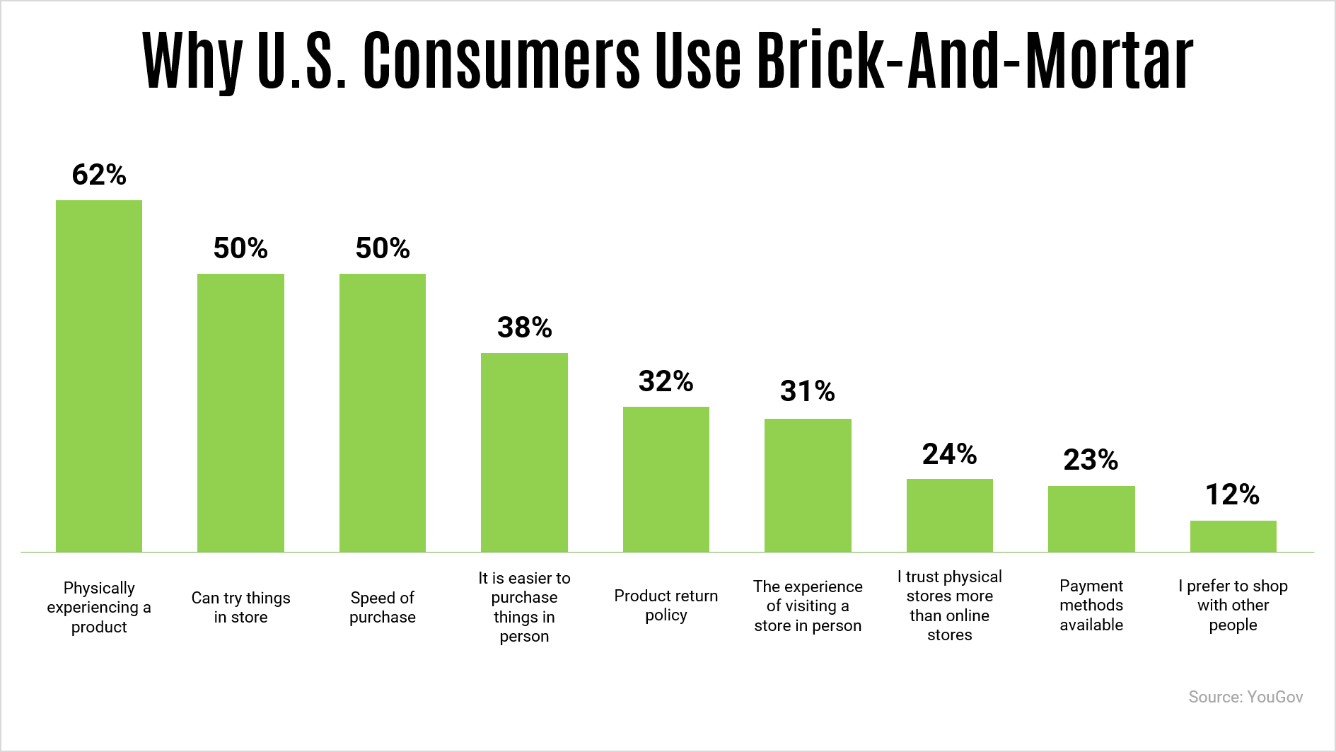Even with the high growth of online shopping during last year, consumers still want to shop in-store. The top reasons people shop in brick-and-mortar include physically experiencing products (62%), trying things in store (53%), and the speed of purchase (45%).