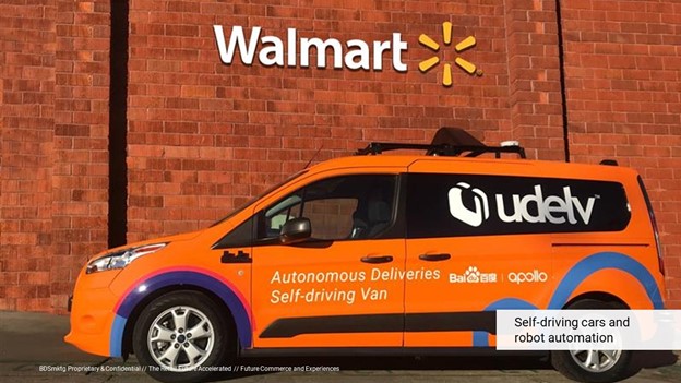 Self-driving cars, like this one from Walmart, will be commonplace going forward! As retail begins to invest in this futuristic automation to meet customer demands, operational efficiencies from robotics will reinvent product delivery, orders will be filled faster, and customer expectations will be met quicker.