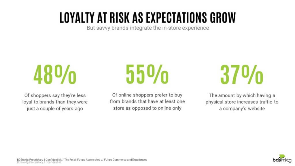 However, these greater connected commerce experiences will absolutely lead to greater expectations! Which unfortunately puts brand loyalty at risk. One bad experience can push all the dominos down in a line, inspiring your loyal consumer to switch brands because they received a better experience elsewhere. In fact, 48% of shoppers say they are less loyal to brands now, and product availability, convenience, and pricing rank as the three highest reasons for why a consumer made a switch.